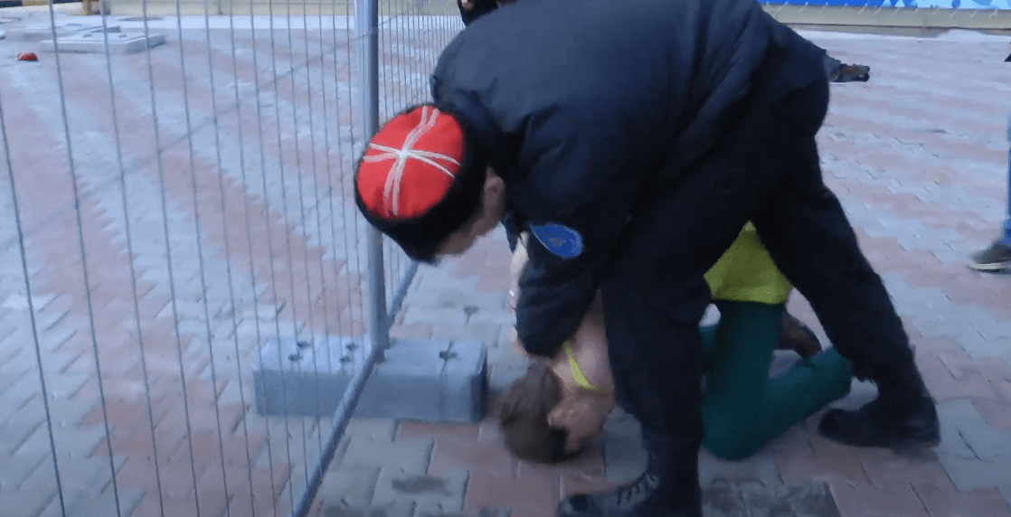 Один из казаков распылил газ в лицо Толоконниковой. Она продолжала петь и танцевать, держа микрофон одной рукой и закрыв глаза другой. Другой мужчина в казачьей форме (опознанный активистами) напал на активистов с хлыстом, ударив Толоконникову по ноге, а Марию Алёхину по животу.
