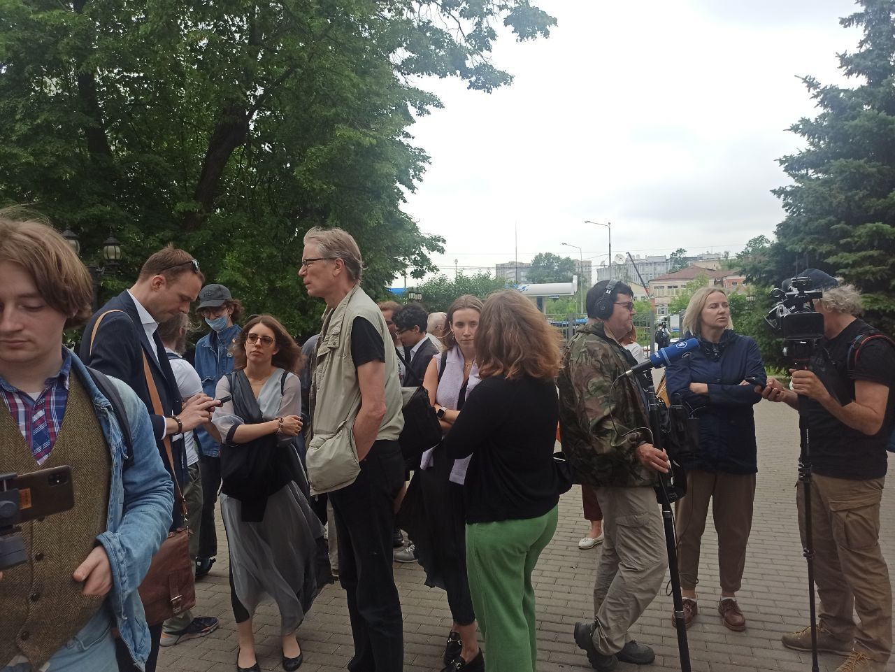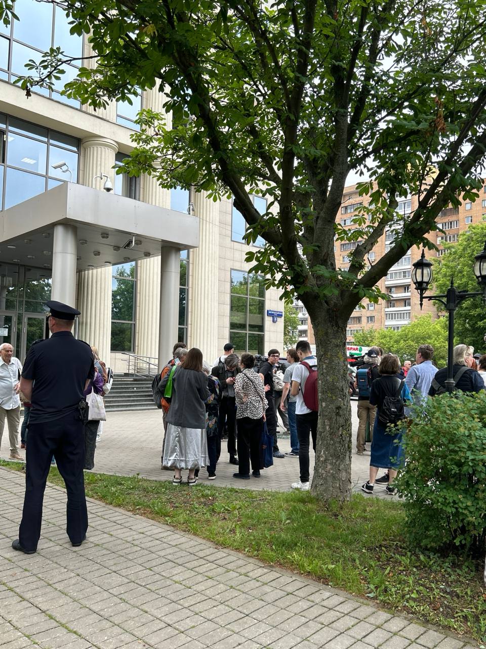 Несколько десятков людей снаружи и внутри суда ждут начала заседания.